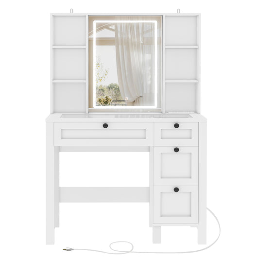 Vanity Desk, Makeup Vanity with Glass Tabletop & Power Outlet, Vanity Desk with Mirror and Lights, Makeup Vanity Desk with 4 Drawers & 6 Shelves, Vanity Set for Bedroom, Antique White
