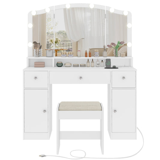 Vanity Desk with Triple Folding Mirror, Makeup Vanity with Power Outlet, Vanity Desk with 10 Lights, 3 Drawers & 2 Cabinets, Makeup Vanity Table with Soft Cushioned Stool for Women, Bedroom, White