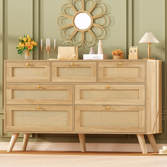 47.2''Wide 7 Drawer Dresser for Bedroom, Rattan Dresser Chest of Drawers, Modern Wood Dresser Chest for Bedroom, Living Room, Entryway, Natural