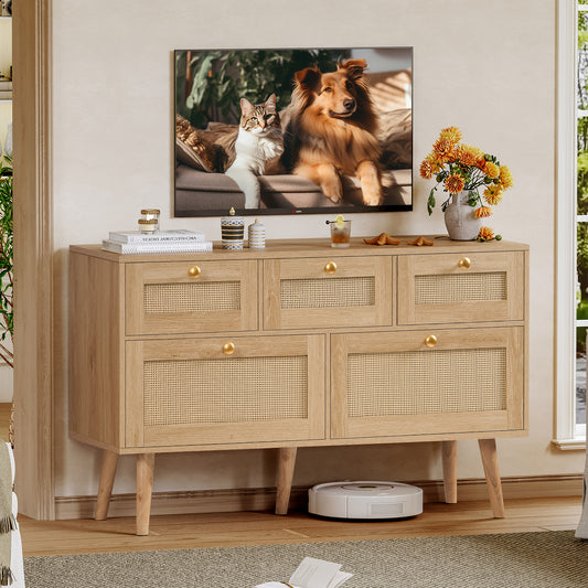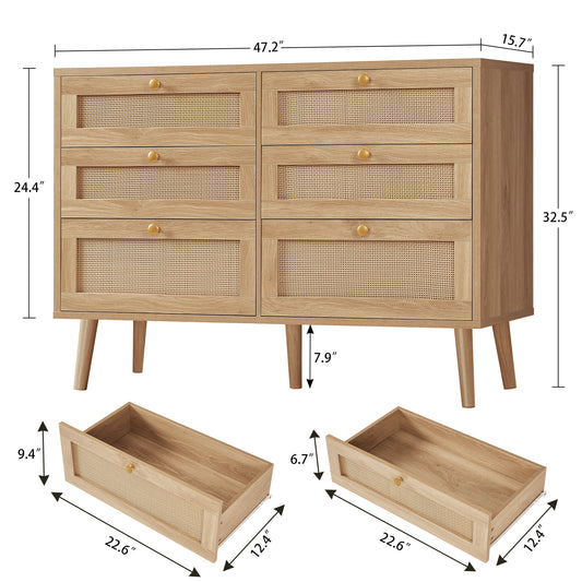 47.2''Wide 6 Drawer Dresser for Bedroom, Rattan Dresser Chest of Drawers, Modern Wood Dresser Chest for Bedroom, Living Room, Entryway, Natural