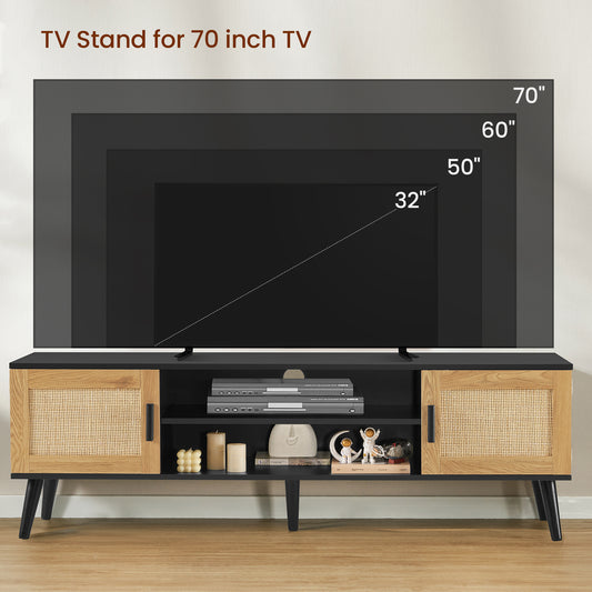 Rattan TV Stand for 70 inch TV, Entertainment Center with Adjustable Shelf & 2 Cabinets, TV Stands for Living Room, Bedroom, Natural + Black