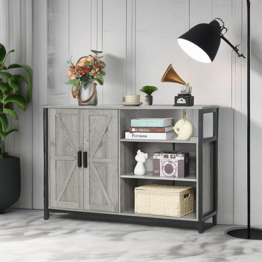 Floor Storage Cabinet, Buffet Storage Cabinet with 2 Barn Doors, Industrial Sideboard with Adjustable Shelves, Buffet Table for Dining Room, Living Room, Kitchen