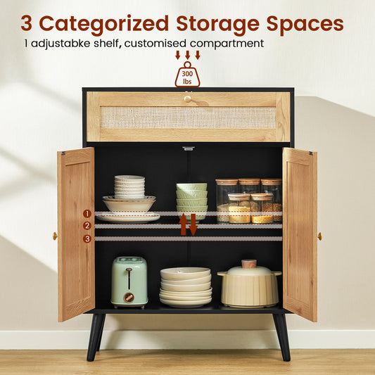 Storage Cabinet with Adjustable Shelf, Rattan Cabinet with Large Drawer, Accent Cabinet for Dining Room, Living Room, Entryway