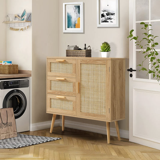 Storage Cabinet with 3 Drawers, Rattan Cabinet with Adjustable Shelf, Accent Cabinet for Living Room, Entryway